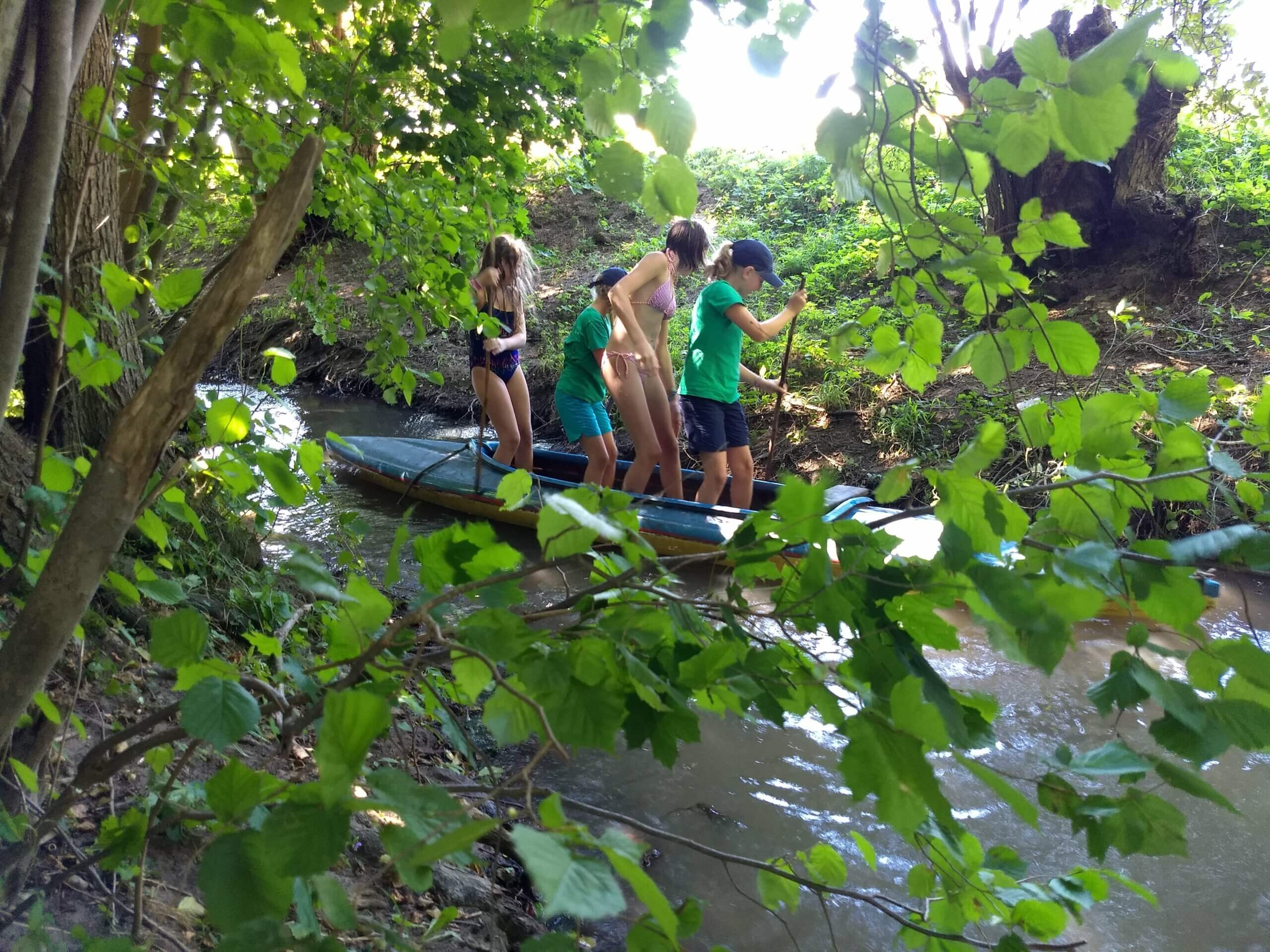 Spaß im hauseigenen Bach mit Kajak und Baumstammbrücke