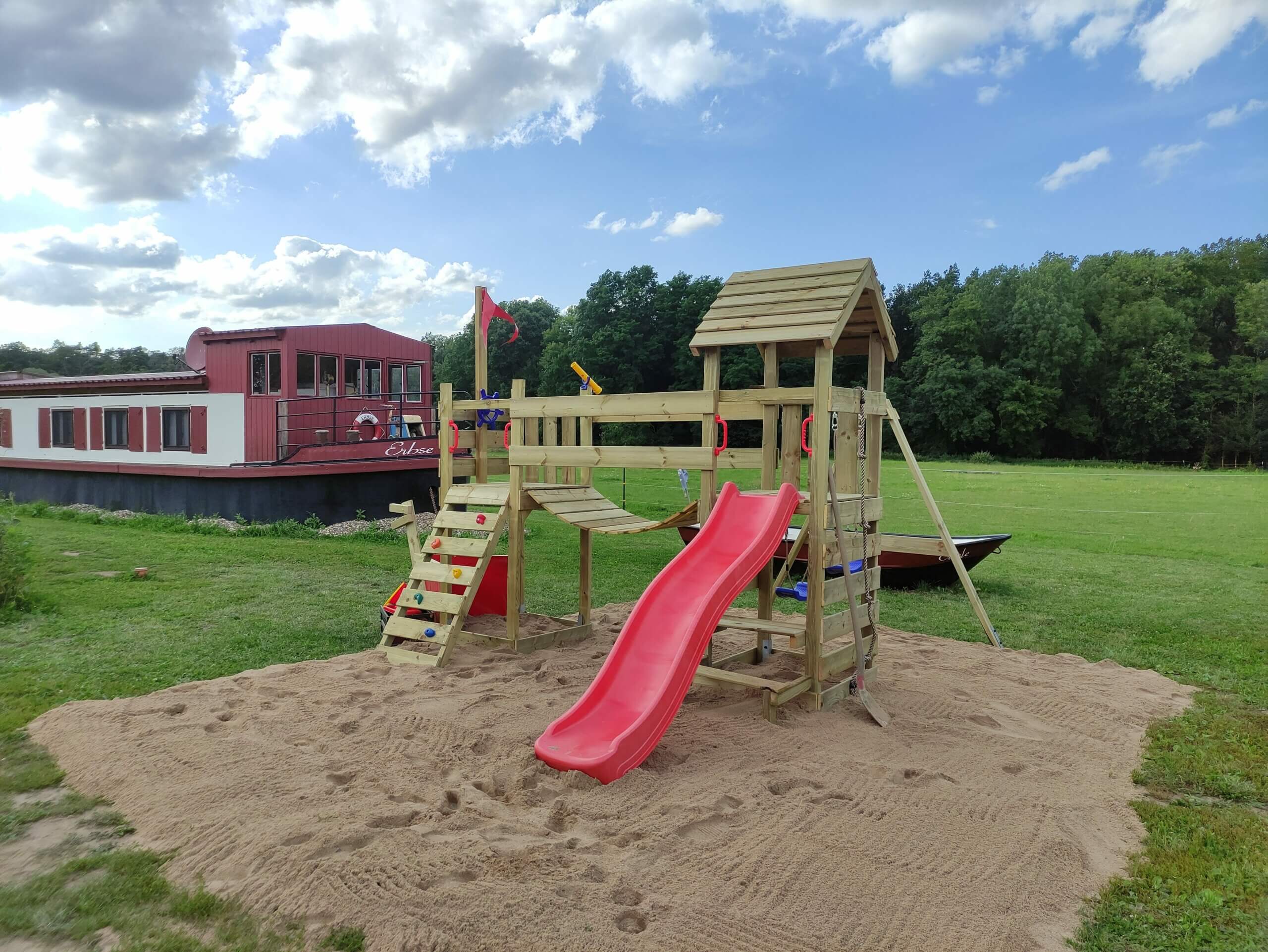 Das Baumhaus mit überdachtem Sandkasten und ein Spielschiff bringen Kinderaugen zum leuchten.